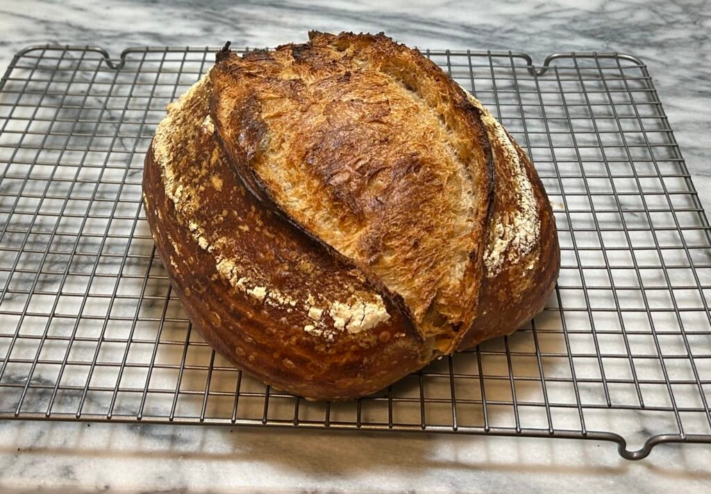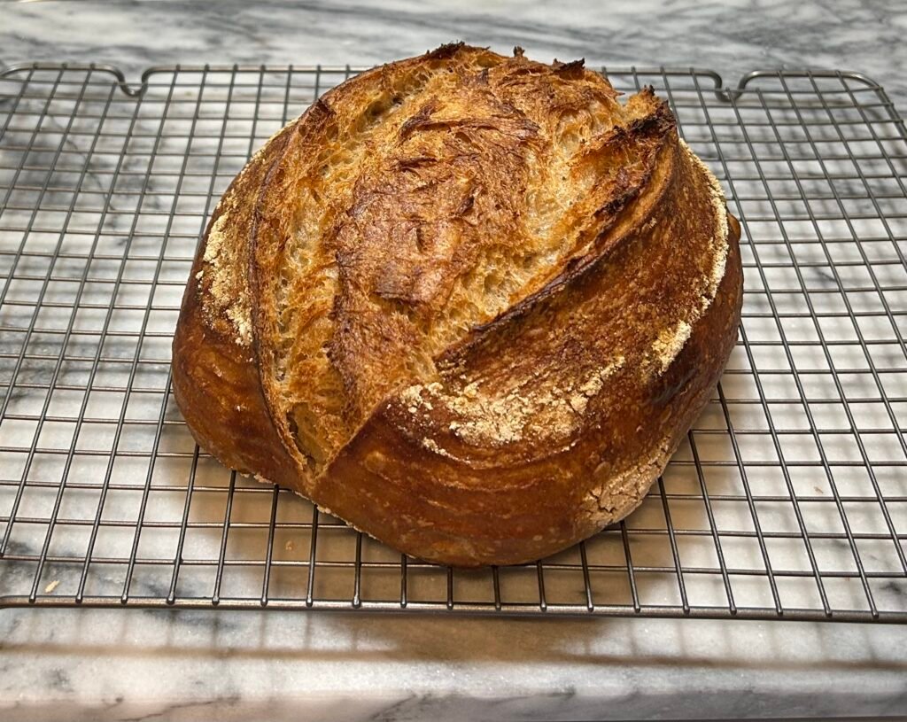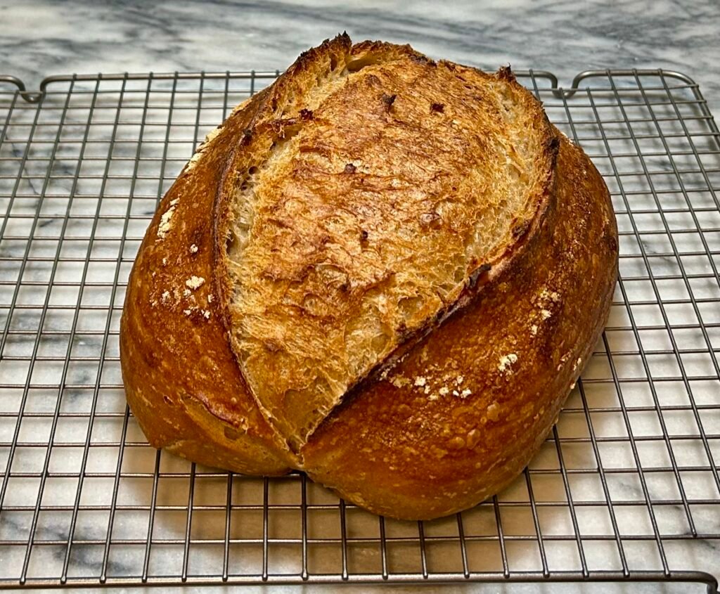 A matter of not judging a book by its cover–this loaf looks nearly perfect on the outside but is a bit small and feels denser than I’d like. The problem being that it just never really hit a phase of fast rising where the activity surpasses the detrimental effects of acid on the gluten. Decisions were made and a slightly dense loaf was chosen over a loaf that went too long and could no longer hold any shape.